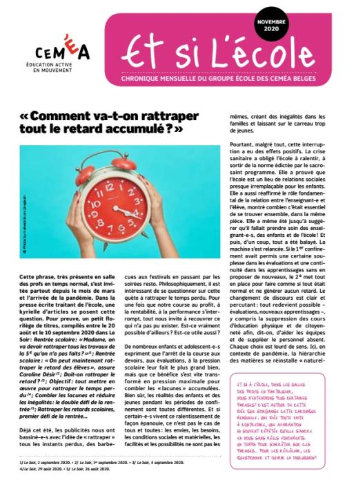 Cette phrase, très présente en salle des profs en temps normal, s’est invitée partout depuis le mois de mars et l’arrivée de la pandémie. Dans la presse écrite traitant de l’école, une kyrielle d’articles se posent cette question. Pour preuve, un petit florilège de titres, compilés entre le 20 août et le 10 septembre 2020 dans Le Soir : Rentrée scolaire : « Madame, on va devoir rattraper tous les travaux de la 5e qu’on n’a pas faits ? » ; Rentrée scolaire : « On peut maintenant rattraper le retard des élèves », assure Caroline Désir ; Doit-on rattraper le retard ? ; Objectif : tout mettre en œuvre pour rattraper le temps perdu ; Combler les lacunes et réduire les inégalités : le double défi de la rentrée ; Rattraper les retards scolaires, premier défi de la rentrée…