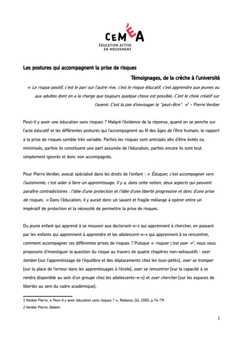 CEMÉA Belgique « Les postures qui accompagnent la prise de risques : Témoignages, de la crèche à l’université » - CEMÉACTION « Courir le risque », 2025.
