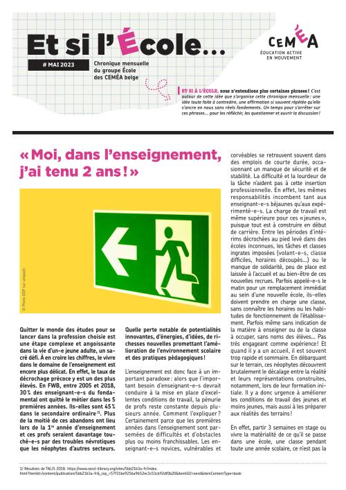En effet, le taux de décrochage précoce y est un des plus élevés. En FWB, entre 2005 et 2018, 30% des enseignant-e-s du fondamental ont quitté le métier dans les 5 premières années. Ils-elles sont 45% dans le secondaire ordinaire /¹. Plus de la moitié de ces abandons ont lieu lors de la 1re année d’enseignement et ces profs seraient davantage touché-e-s par des troubles névrotiques que les néophytes d’autres secteurs.