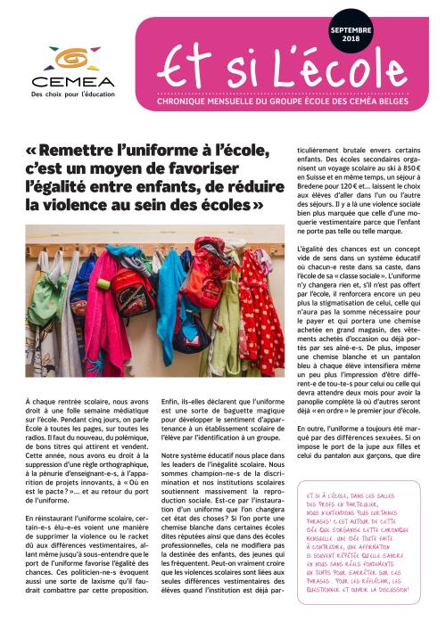 Et si à l’école, dans les salles des profs en particulier, nous n’entendions plus certaines phrases ! C’est autour de cette idée que s’organise cette chronique mensuelle : une idée toute faite à contredire, une affirmation si souvent répétée qu’elle s’ancre en nous sans réels fondements. Un temps pour s’arrêter sur ces phrases...pour les réfléchir, les questionner et ouvrir la discussion ! Ce mois-ci nous parlons du port de l’uniforme.